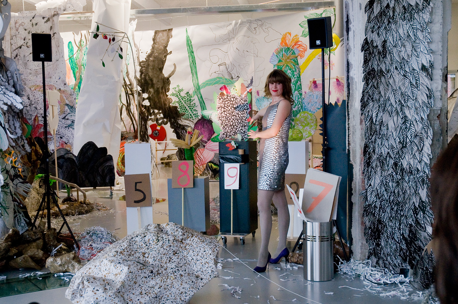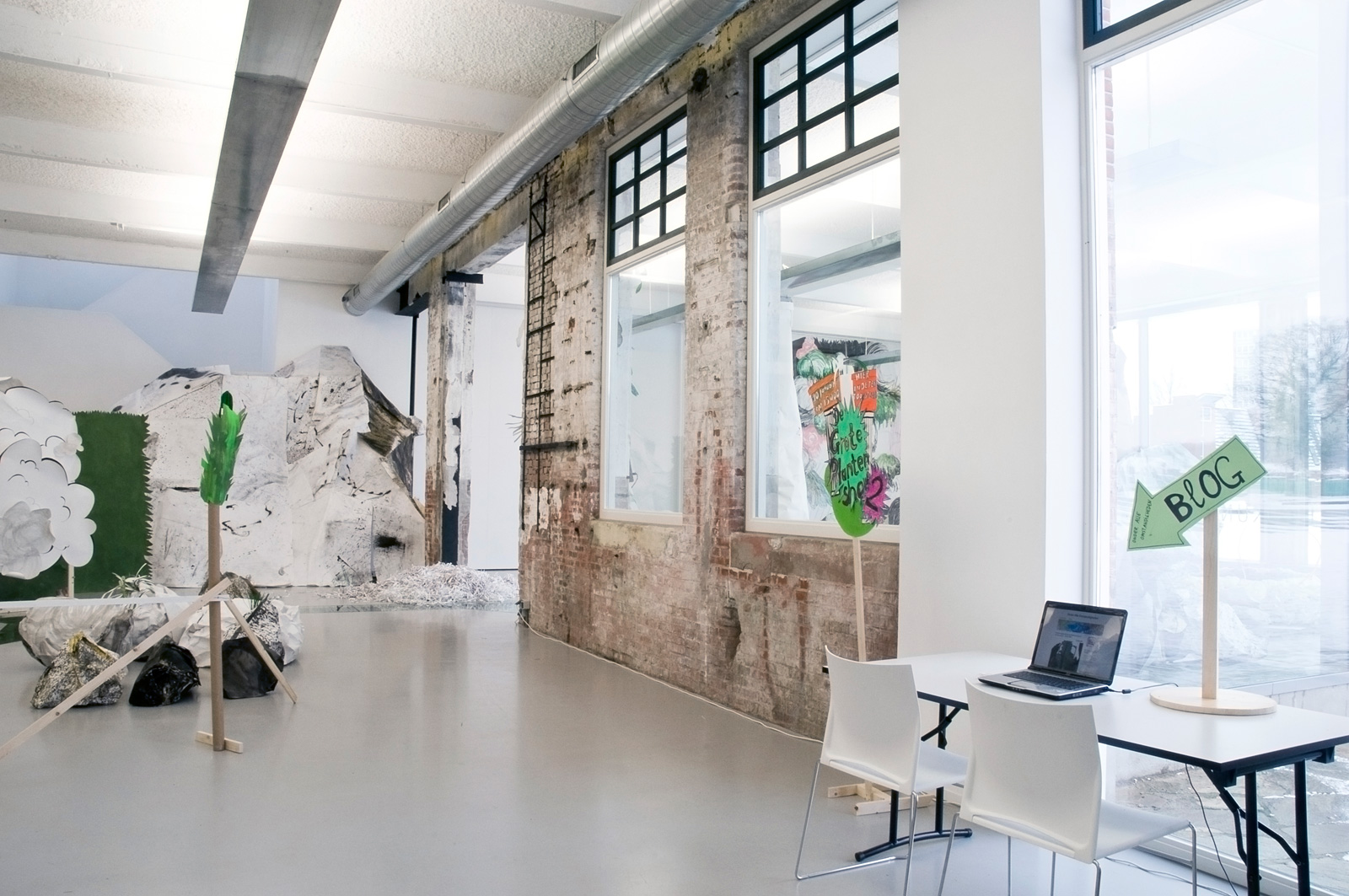 Het Harde Potlood (Richtje Reinsma, 1979, Roosmarijn Schoonewelle, 1980 en Heleen Wiemer, 1978) is een ondernemend collectief met fantastische ideeën. Ik wilde met hen een tentoonstelling maken die voortdurend zou veranderen en die tijdens de opening niet af hoefde te zijn, sterker nog, pas zou starten. Het drietal speelde prachtig in op mijn wens door een ‘tuin’ aan te leggen van immense tekeningen en constructies van plastic, hout en papier.
