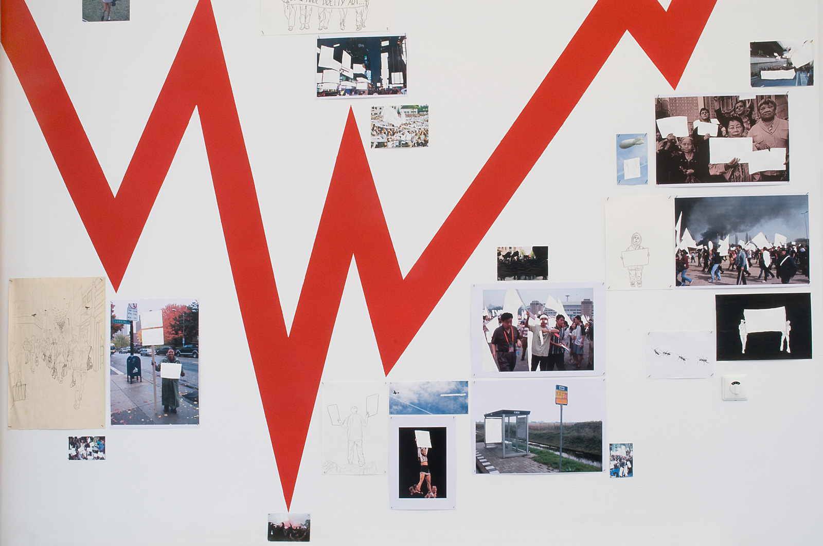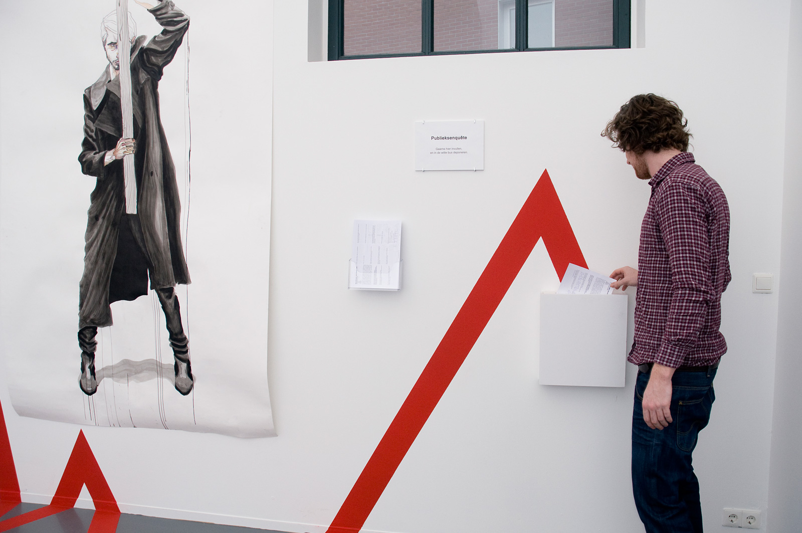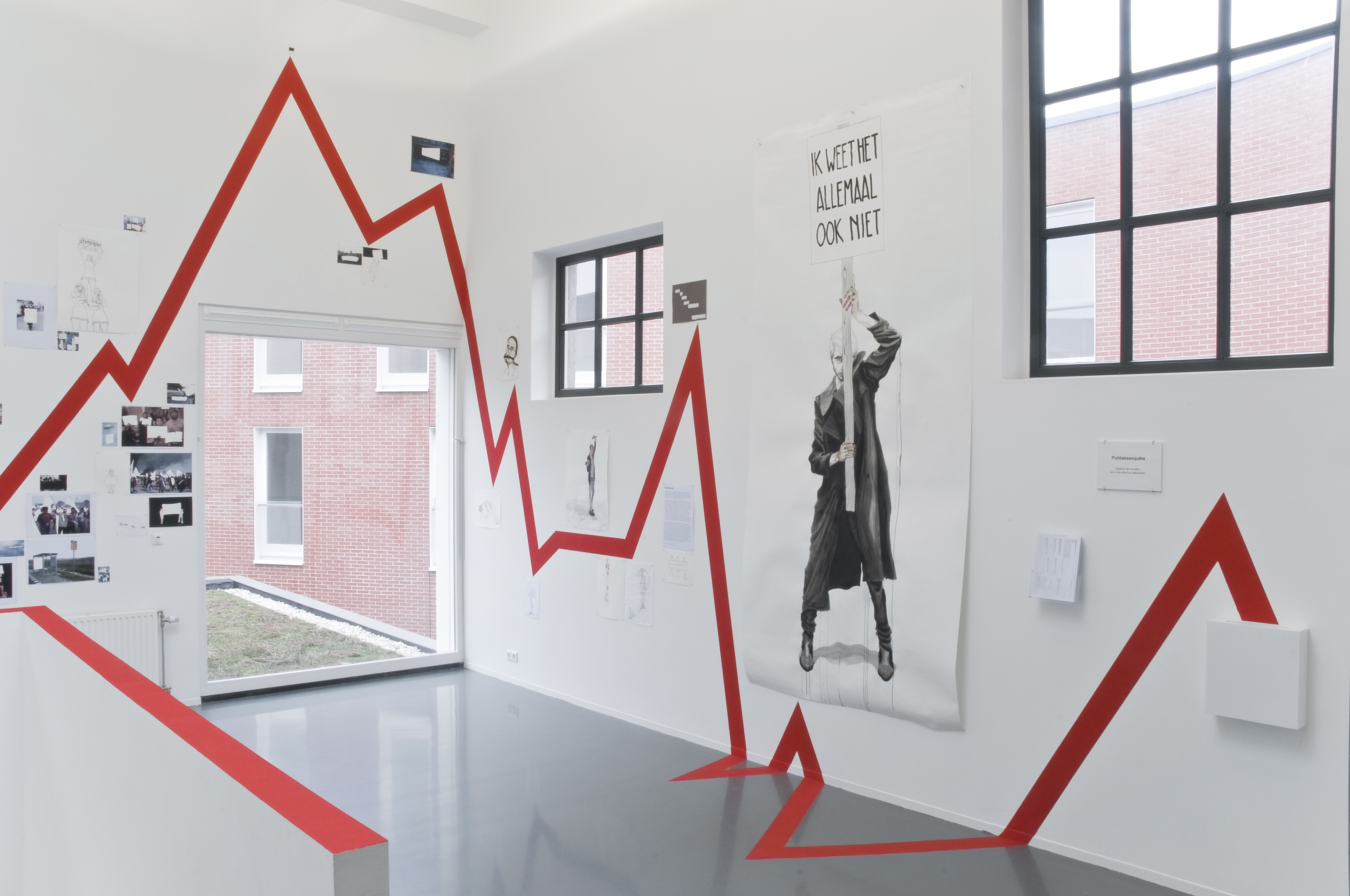 De rode lijn die zijn tekeningen en collages verbond, gidste de kijker door vier fasen: Constatering: we lopen onbevredigd en doelloos, blind achter elkaar aan; Analyse: we zitten vast; Conclusie: we zitten op het 0-punt van een identiteitscrisis en Toekomst: Wij kunnen nu de koers bepalen, waar willen we heen? De tekeningen en collages droegen titels als Ondragelijke Luchtigheid van Onmacht, Het Feest Kan Beginnûh, Getemde mens en Instituut voor Nieuwe Ethetica. De lijn verwees naar een grafieklijn zoals de AEX-index, een tijdslijn of een hartritme. Daar waar de rode lijn eindigde, bij het hier en nu, hing een vragenlijst. Deze hielp de bezoeker in het bepalen van diens positie. Zelf schroom ik nog weleens om aan grote vraagstukken te beginnen, maar met deze kunstenaar in de buurt begrijp ik eigenlijk niet meer waarom. Zijn enthousiasme, bevlogenheid en overtuiging om vraagstukken tot de bodem toe uit te zoeken, zijn aanstekelijk.