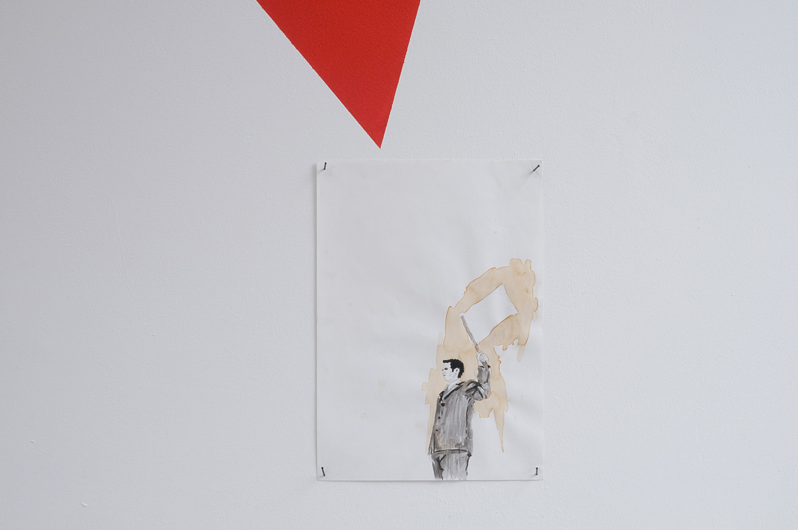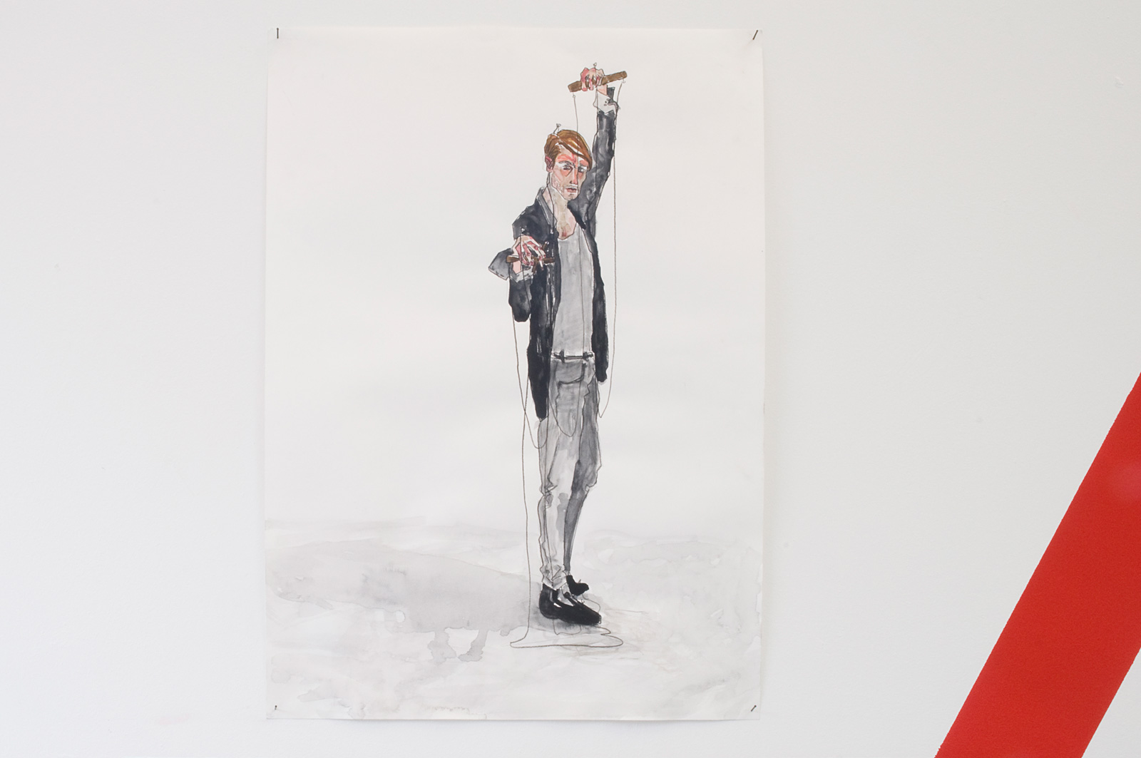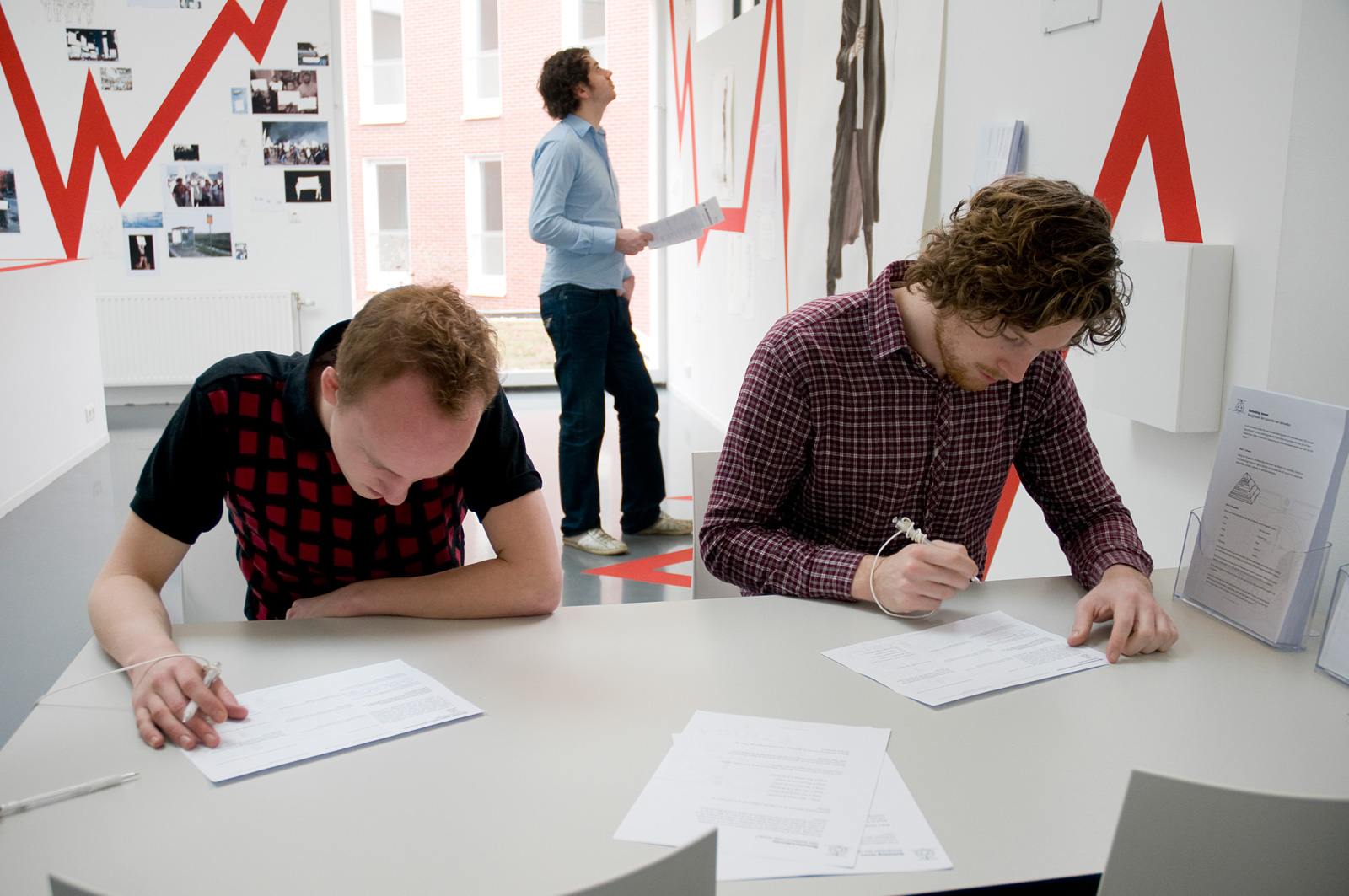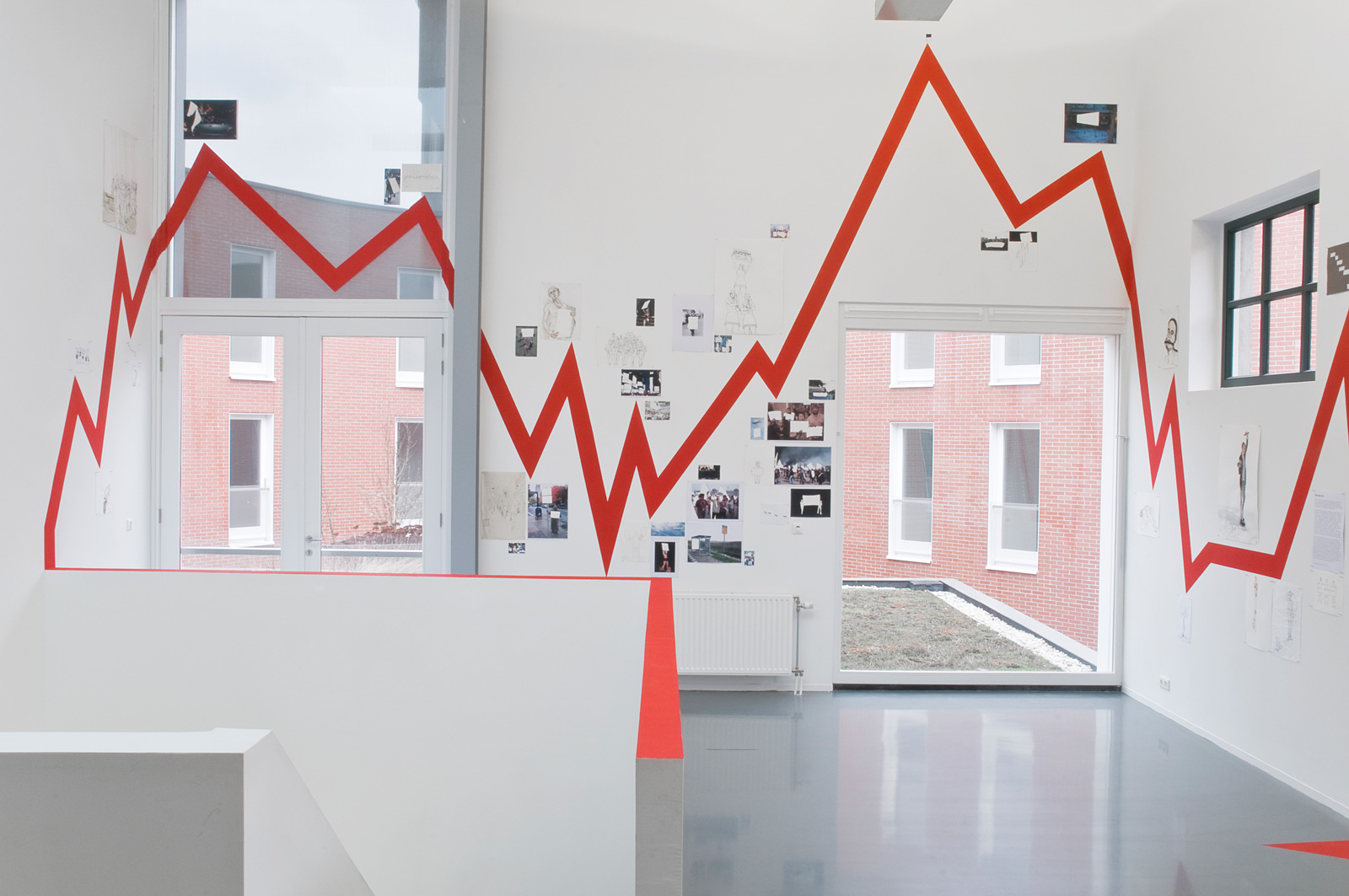 De rode lijn die zijn tekeningen en collages verbond, gidste de kijker door vier fasen: Constatering: we lopen onbevredigd en doelloos, blind achter elkaar aan; Analyse: we zitten vast; Conclusie: we zitten op het 0-punt van een identiteitscrisis en Toekomst: Wij kunnen nu de koers bepalen, waar willen we heen? De tekeningen en collages droegen titels als Ondragelijke Luchtigheid van Onmacht, Het Feest Kan Beginnûh, Getemde mens en Instituut voor Nieuwe Ethetica. De lijn verwees naar een grafieklijn zoals de AEX-index, een tijdslijn of een hartritme. Daar waar de rode lijn eindigde, bij het hier en nu, hing een vragenlijst. Deze hielp de bezoeker in het bepalen van diens positie. Zelf schroom ik nog weleens om aan grote vraagstukken te beginnen, maar met deze kunstenaar in de buurt begrijp ik eigenlijk niet meer waarom. Zijn enthousiasme, bevlogenheid en overtuiging om vraagstukken tot de bodem toe uit te zoeken, zijn aanstekelijk.